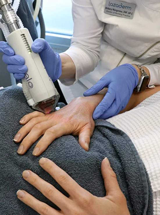 The face is usually the first place one thinks of when treating aging symptoms, but the hands and neck can show signs of aging equally as much. We offer discounted prices for adding hands and/or neck to your treatment in addition to the face. BroadBand Light, Halo, and Filler treatments have all be used on the hands.