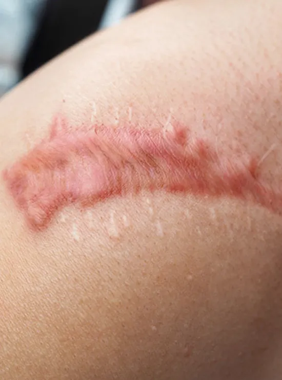 Keloid scars are similar but are not the same thing as hypertrophic scars. Keloid scars are also an abnormal response to injury, but these thick, raised scars can grow outside the boundaries of the original injury. They may continue to grow over time. Keloid scarring tends to form on the earlobes, shoulders, cheeks and chest. Keloids are usually more common in patients with darker skin.